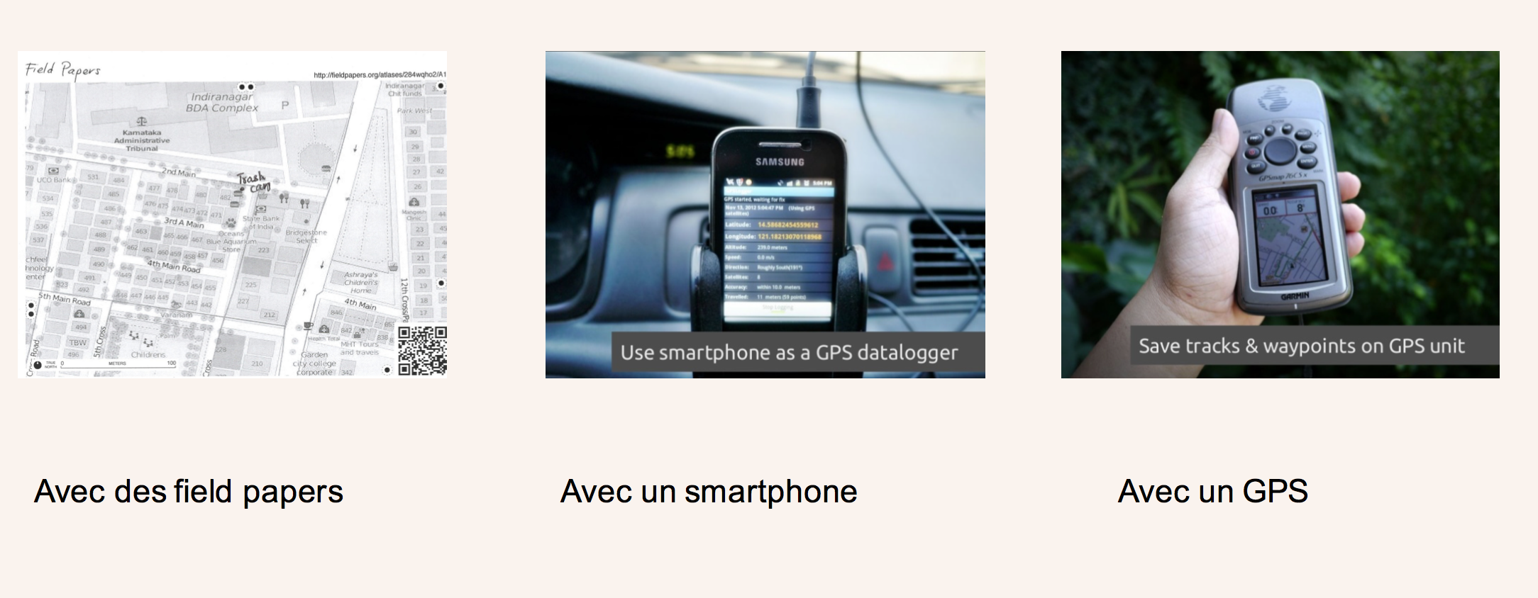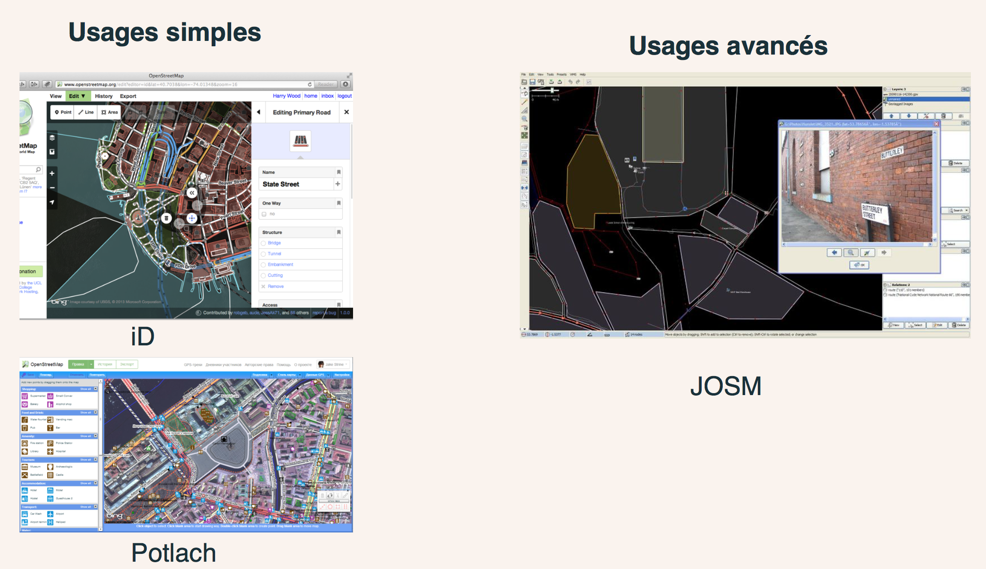 class: center, middle, inverse, title-slide # Formation à la cartographie participative ## Les Clés de la Cité ### Joël Gombin, Datactivist ### 6 décembre 2018 --- layout: true <div class='my-footer'><span>Formation à la cartographie</span> <center><div class=logo><img src='https://github.com/datactivist/slides_datactivist/raw/master/inst/rmarkdown/templates/xaringan/resources/img/fond_noir_monochrome.png' width='100px'></center></span></div> --- class: center, middle Ces slides en ligne : http://datactivist.coop/carto Sources : https://github.com/datactivist/carto Les productions de Datactivist sont librement réutilisables selon les termes de la licence [Creative Commons 4.0 BY-SA](https://creativecommons.org/licenses/by-sa/4.0/legalcode.fr). <BR> <BR>  --- ## Qui sommes nous ? <BR><BR><BR><BR> [](https://datactivist.coop) ### We .red[open data], we make them .red[useful] --- ## Qui sommes nous ?  --- ## Qui sommes nous ? - Datactivist est un .red[**pure player de l’open data**] créé en 2016, par Samuel Goëta et Joël Gombin. - Se positionnant sur .red[**toutes les étapes du travail d’ouverture des données**], Datactivist travaille tant avec les producteurs de données qu’avec les réutilisateurs et participe à l’appropriation des données par chacun. - Nous appliquons nos propres .red[**valeurs**] : nous sommes une coopérative ; nos supports de formation et nos contenus sont librement réutilisables, publiés en licence Creative Commons. - Une approche issue de la recherche : voir notamment **https://datactivist.coop/these**. - Nous animons la communauté [#TeamOpenData](https://teamopendata.org). --- ## Nos activités - Conseil sur les .red[**stratégies d’ouverture de données**] : nous aidons les organisations dans la conception et la mise en œuvre de leur stratégie d’ouverture de données. - .red[**Accompagnement dans la réutilisation de données ouvertes**] : nous aidons les organisations à utiliser les données au quotidien. - .red[**Sensibilisation et formation à la donnée**] : nous formons à la culture générale des données, nous enseignons les grands principes et bonnes pratiques de l'open data et nous introduisons à la data science. - .red[**Médiation de données**] : nous organisons des hackathons, des open data camps, des expéditions de données... ??? La médiation de données est aussi fondamentalement une animation de communauté(s). --- ## Pourquoi cartographier ? Au départ... cartographier est un projet de puissance ! .center[] --- ## Pourquoi cartographier ? La cartgraphie est aussi un outil de savoir et de compréhension : il permet d'appréhender le monde et, plus précisément, d'explorer la dimension spatiale des phénomènes physiques ou sociaux. --- ## Pourquoi cartographier ? Enfin, la cartographie peut être un outil militant (voir https://neocarto.hypotheses.org/category/cartographie-radicale par exemple) et d'émancipation, d'appropriation d'un territoire vécu voir par exemple https://alterites.hypotheses.org/373). --- ## Qu'est-ce qu'une carte ? > "Une carte est une représentation géométrique plane simplifiée et conventionnelle de tout ou partie de la surface terrestre, et cela dans un rapport de similitude convenable qu'on appelle échelle." (F. Joly, 1976) Référence : [Béguin et Pumain, 2014 (3e éd.)](http://www.persee.fr/web/revues/home/prescript/article/espos_0755-7809_1998_num_16_1_1827_t1_0119_0000_2) --- ## La notion de projection La projection est l'outil mathématique qui permet de passer du géoïde représentant la Terre à une représentation plane. Projections conformes (Mercator, Lambert) ou équivalentes (Eckert IV, Gall). Il y a toujours une déformation ! Les coordonnées géographiques sont exprimées en longitude et latitude. Les unités peuvent être des degrés ou des grades. La projection transforme les coordonnées géographiques en coordonnées x/y. --- <iframe width='800' height='600' src='http://bl.ocks.org/syntagmatic/ba569633d51ebec6ec6e'></iframe> --- class: center, middle <iframe width="800" height="450" src="https://www.youtube.com/embed/vVX-PrBRtTY" frameborder="0" allowfullscreen></iframe> --- ## L'échelle L'échelle d'une carte représente le rapport d'une distance mesurée sur la carte à sa valeur réelle sur le terrain. Échelle | 1 cm représente ---------------|---------------- 1/10000 |100 m 1/25000 |250m 1/50000 |500m 1/100000 |1km 1/1000000 |10km --- ## L'échelle Attention : "petite échelle" = grande superficie représentée "grande échelle" = petite superficie représentée L'échelle est déformée à distance du centre de projection (équateur pour Mercator) Échelle numérique et échelle graphique --- class: center, middle <img src='./img/carteParis1.png'/> --- ## La généralisation "L'opération qui par sélection, schématisation et harmonisation reconstitue sur une carte la réalité de la surface représentée dans ses traits essentiels en fonction du but de la carte, de son thème, de son échelle et des particularités de la région cartographiée." --- ## La sélection Quelles couches d'information représenter ? Ni trop (surcharge d'information, à la Google Maps) ni trop peu (rendre la carte intelligible au lecteur). .center[] --- ## La schématisation Opération de simplification, qui peut être structurale (tracés) ou conceptuelle (schéma). Attention : on peut simplifier à partir de données détaillées, mais on ne peut pas faire l'inverse ! Donc toujours veiller à conserver les données dans leur forme la plus détaillée. --- ## Le fond de carte Le fond de carte est constitué des éléments repris d'une carte topographique (par exemple de l'IGN) et utilisés pour une carte thématique. "Carte reproduite totalement ou partiellement, en une ou plusieurs couleurs souvent atténuées, servant de repère pour le report en surcharge de phénomènes localisables déterminés" (CFC). Peut concerner les découpages administratifs, le réseau routier