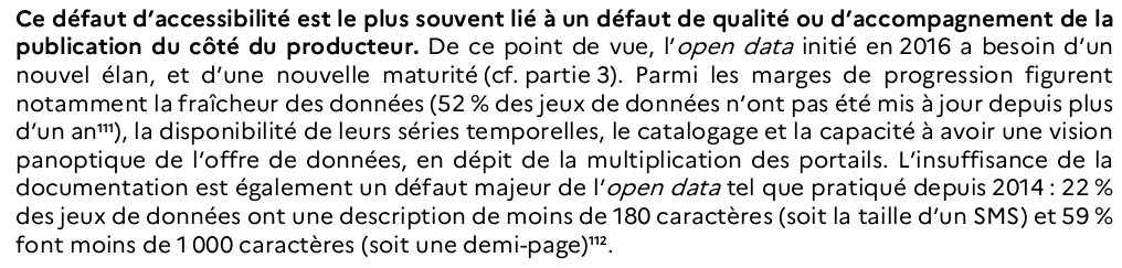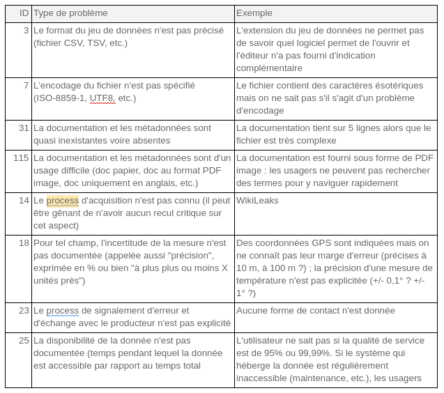 des données ## Webinaire ‘Ouvrir ma ville’ saison 2 ### Sylvain Lapoix, Datactivist ### 12/01/2021 --- layout: true <div class='my-footer'><span>Webinaire Ouvrir ma ville - Qualité des données</span> <center><div class=logo><img src='https://github.com/datactivist/slides_datactivist/raw/master/inst/rmarkdown/templates/xaringan/resources/img/fond_noir_monochrome.png' width='100px'></center></span></div> <style type="text/css"> .yellow-h{ background: #ffff88; } .blue-h{ background: #83c7fc; } </style> --- class: center, middle Ces slides en ligne : http://datactivist.coop/futurocite_ouvrir-ma-ville/qualite_donnees Sources : https://github.com/datactivist/futurocite_ouvrir-ma-ville/qualite_donnees Les productions de Datactivist sont librement réutilisables selon les termes de la licence [Creative Commons 4.0 BY-SA](https://creativecommons.org/licenses/by-sa/4.0/legalcode.fr). <BR> <BR>  --- background-image: url("https://media.giphy.com/media/1gR4aiU6sU89sS7ddI/giphy.gif") class: center, top, inverse # Introduction ## créons ensemble un petit jeu de données pour voir --- ### Un formulaire tout simple Je vous demande de remplir [un bref formulaire de contact](https://forms.gle/bxcerXq2MT9aJXC2A) afin de constituer un petit jeu de données sur les participant·es à ce webinaire (les données seront bien entendu supprimées à l'issue de l'exercice). .center[  ] --- ### Quels usages pourrions-nous faire de ces données si elles étaient publiées en open data ? -- Quelques propositions : * un calculateur de trajet pour les services publics ; * une rapide étude statistique sur l'ancienneté professionnelle ; * un annuaire d'agents publics de Wallonie ; -- Mais qu'est-ce qui nous gênerait dans la forme des données proposées ? D'où viennent ces problèmes ? --- ### Quelques constats 1. l'outil de collecte de données influe sur la forme des données en sortie ; -- 2. la praticité du jeu de données varie selon l'usage qu'on souhaite en faire ; -- 3. le recours à des formats standardisés assure un usage facilité des données. -- #### Bref, nous voilà au coeur de la question de .red[la qualité des données] ! --- background-image: url("https://media.giphy.com/media/l0HlG9v9KeDXsHC2A/giphy.gif") class: center, top, inverse # 1. Evaluer la *"qualité"* --- background-image: url("https://media.giphy.com/media/3o7buh0sx5p7qrnJ5u/giphy.gif") class: center, top, inverse ### Selon vous, qu'est-ce qu'une<br>"*donnée sale*" ? --- ### Une donnée "sale" Que ce soit pour des raisons techniques ou organisationnelles, il arrive que les données fournies soient jugées "sales". Une donnée est jugée sale quand son format gêne son utilisation, que ce soit par un humain ou par une machine. Plusieurs dimensions d'une base de données peuvent contribuer à sa saleté : * une source manquante, défectueuse, imprécise ; * des têtières incompréhensibles, redondantes, incomplètes ; * des données imbriquées, mal formatées, lacunaires, excédentaires ; * des colonnes mal agencées, des lignes incohérentes, une mauvaise architecture... --- ### Une "donnée propre" ? Une "donnée propre" est une donnée qui répond à quelques critères qui assure sa lisibilité et son usage sans déperdition de sens. Pour en rester aux critères principaux : * une donnée est propre quand elle est reconnue par la machine pour ce qu'elle est ; * une donnée est propre quand elle est lisible par l'utilisateur·rice ; * une donnée est propre quand elle permet de faire les calculs nécessaires. -- Autrement dit : **une donnée propre est souvent une donnée transformée par rapport à sa source suivant des besoins précis**. --- ### Pourquoi nettoyer ses données ? .pull-left[Le *"travail de balayeur"* que s'avère être le nettoyage n'est pas une petite tâche : [d'après des entretiens menés par le New York Times en 2014](https://www.nytimes.com/2014/08/18/technology/for-big-data-scientists-hurdle-to-insights-is-janitor-work.html), il engouffre 50 à 80% du temps de travail des data scientists. En tant que producteur·rices de données, **vous serez généralement tenu·es pour responsables de la publication de données sales**.] .pull-right[  ] --- background-image: url("https://media.giphy.com/media/7SX1EWzetp0GVAgoqp/giphy.gif") class: center, top ### Et alors, en quoi ça me concerne ? --- ### 1ère bonne raison : créer des usages .pull-left[Des jeux de données de bonne qualité facilitent et encouragent la réutilisation : 1. création de nouveaux services par votre administration ou d'autres ; 2. réutilisation par le tissu associatif ou bénévole de votre collectivité ; 3. développement de services par des start-ups et création d'emploi et de valeur. Mieux préparées, vos données contribuent à l'information et à l'activité sur votre territoire avec des bénéfices sociaux et économiques nombreux. ] -- .pull-right[#### Ex. : du menu des cantines à QuiDitMiam Lancée en s'appuyant sur les menus des cantines ouverts à Toulouse, l'application QuiDitMiam propose un accès aux menus des restaurations collectives en y ajoutant une couche d'information sur les allergènes, label, etc. Voir leur fiche réutilisation sur [data.gouv.fr](https://www.data.gouv.fr/en/reuses/quiditmiam/).  ] --- ### 2ème bonne raison : moins de SAV .pull-left[Que ce soit le temps de réponse aux administré·es pour résoudre des soucis ou les bugs dans la production interne à l'administration, standardiser ses données est plus efficace que compenser les insuffisances des jeux de données au départ. [Comme l'a constaté l'équipe de la ville d'Issy-les-Moulineaux](https://medium.com/datactivist/construire-des-tableaux-de-bord-dynamiques-au-service-de-lopen-data-et-de-la-collectivit%C3%A9-ec514020c027) (région parisienne) avant d'opter pour un schéma de qualité de données : ] .pull-right[ *"Problème : ces tableaux et rapports sont dans des structurations et des formats différents selon les services. Chaque a