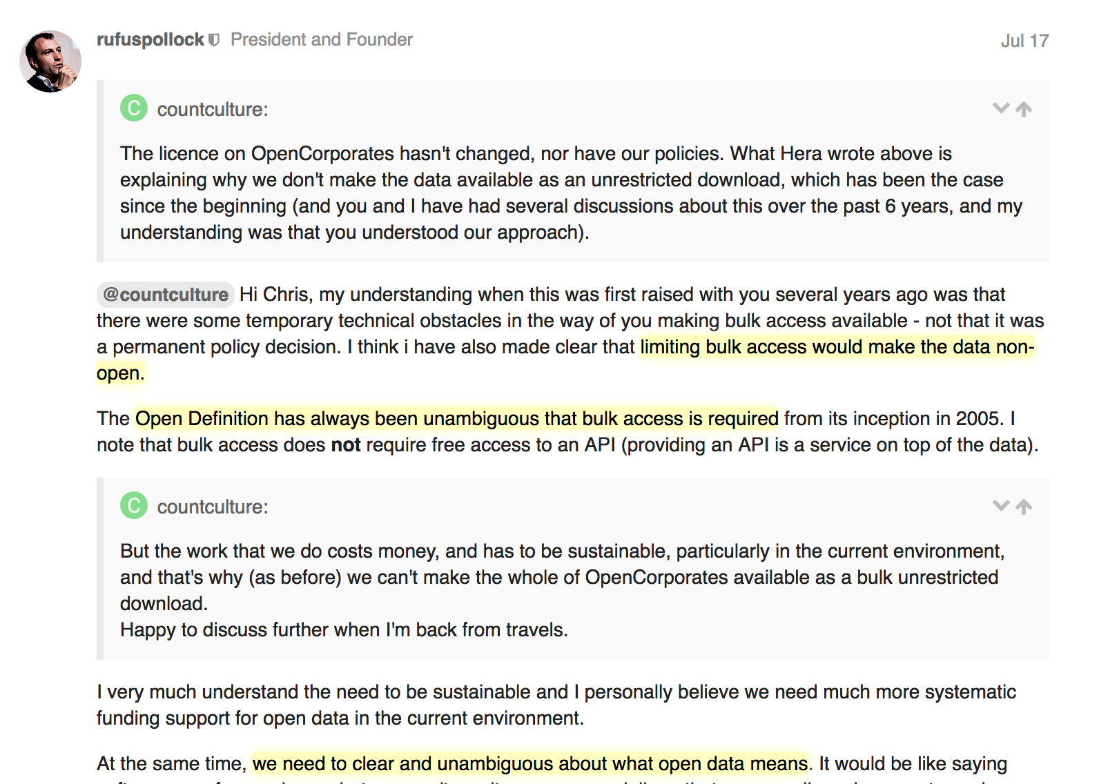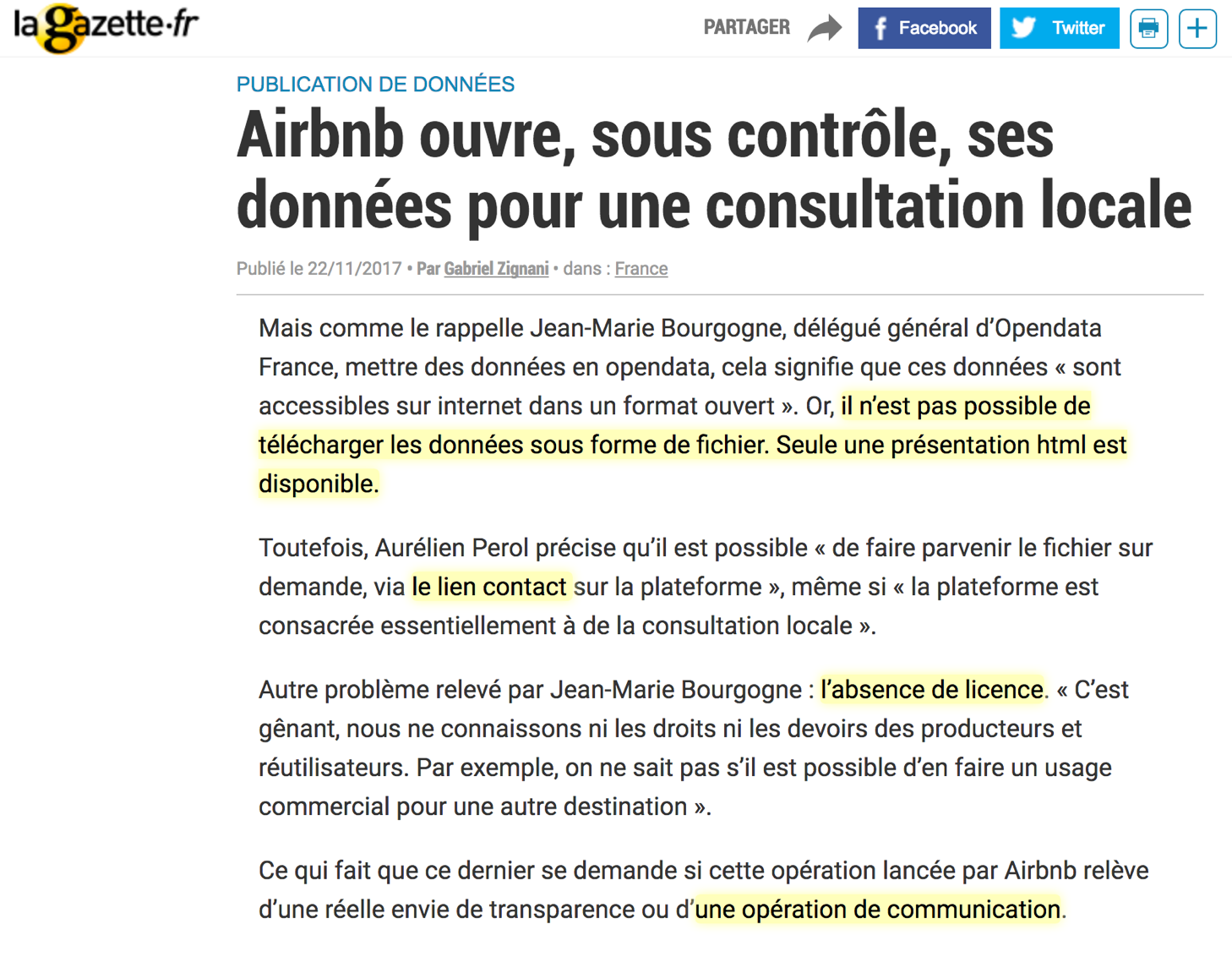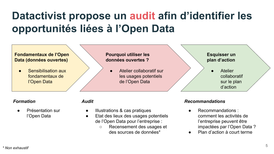 class: center, middle, inverse, title-slide # Quel intérêt les entreprises ont-elles à ouvrir leurs donnnées ? ## Sommet Redefine Open - Open Data Soft ### Samuel Goëta ### 27/11/2017 --- class:middle,center, inverse # Des entreprises assises sur une mine d'or --- class: middle, center  --- class: middle, center  --- class:center, middle  --- class: center, middle Ces slides en ligne : [datactivi.st/rededefineopen](http://datactivi.st/redefineopen) Les contenus créés par Datactivist sont placés sous [licence Creative Commons CC-BY-SA](https://creativecommons.org/licenses/by-sa/3.0/deed.fr). <img src="./img/Logo_DATACTIVIST_TW.png" height="100px" /> --- # Datactivist ? .pull-left[ Société coopérative et participative (SCOP) créée en novembre 2016 🎯Notre mission : ouvrir les données et les rendre utiles et utilisées. 💼**3 grands types de missions**: - Conseil : accompagnement dans l'ouverture et la réutilisation de données - Formations : ouverture des données, culture générale des données, introduction à la data science. - Médiation : accompagner la réutilisation de données que ce soit par un public de spécialistes ou de novices.] .pull-right[  ] --- # Une équipe dédiée à l'ouverture des données .pull-left[  ] .pull-right[ Nous nous appelons activistes car : - **nous militons pour l’ouverture des données** - nous **soutenons les acteurs du changement** - **nous appliquons à nous mêmes les principes** que nous défendons en partageant toutes nos productions sous licence libre.] --- class: inverse, center, middle # Sortir de l'open washing --- class:middle, center  ---  ---  --- class: center, middle  --- class: center, middle  ---  --- class: center, middle  ---  ---  ---  ---  --- class: inverse, center, middle #Soyons plus ambitieux ! ### Ouvrons vraiment les données, rendons les utiles --- class: inverse, center, middle #Constat : les entreprises n'ont pas de données publiques ### Elles ne sont pas soumises à une obligation d'ouverture --- # Sauf dans le domaine des transports [](https://www.legifrance.gouv.fr/affichTexteArticle.do;jsessionid=7361314F82C97FD5BA2215F6FC66C7D0.tpdila14v_2?idArticle=JORFARTI000030978647&cidTexte=JORFTEXT000030978561&dateTexte=29990101&categorieLien=id) --- # La SNCF a su en faire une opportunité…  --- #…Et batir une communauté .reduite[] --- #Obligations aussi dans le domaine de l'énergie… .pull-left[>"Permettre la réutilisation des données détaillées de consommation et de production issues de leur système de comptage d'énergie, dans l'objectif de favoriser notamment le développement d'offres d'énergie, d'usages et de services énergétiques.<br/> **Article 23 de la loi pour une république numérique**] .pull-right[[Décret d'application](https://www.legifrance.gouv.fr/eli/decret/2017/4/5/ECFC1631045D/jo/texte)] --- # …Qui a permis l'ouverture de données de grande valeur .reduite2[] .footnote[Voir [notre formation pour Greenpeace](datactivi.st/formation-greenpeace/index.html#51)] --- ## Ouverture aussi pour les entreprises chargées d'une mission de service publique  --- class: center, middle  --- class: center, middle [](https://datanova.laposte.fr/explore/?refine.keyword=la-poste&sort=modified&refine.publisher=La+Poste+-+Service+National+de+l%27Adresse) --- class: inverse, center, middle # Les entreprises n'ont généralement pas de données publiques ### Mais elles ont des Données d'Intérêt Général (DIG) --- # DIG : un concept qui intéresse l'Etat [](https://www.economie.gouv.fr/files/files/PDF/DIG-Rapport-final2015-09.pdf) --- class: inverse, center, middle # Les entreprises peuvent ouvrir leurs données volontairement ### Mais pourquoi ouvrir des données d'intérêt général ? --- class: inverse, center, middle # 1. Communiquer : je prouve ce que je dis --- class: center, middle  --- class: inverse, center, middle # 2. Valoriser son travail, recruter les meilleur.e.s --- class: center, middle ## Danone : un exemple de données potentiellement d'intérêt général .reduite[] --- class: inverse, center, middle #3. Améliorer ses données, décloisonner l'entreprise ---  --- class: inverse, center, middle #4. Trouver un modèle économique pour l'ouverture des données --- class: center, middle  --- class: inverse, center, middle # Et si on vous aidait à vous lancer ?  --- class: center, middle  --- class: center, middle ## Plus d'infos : http://datactivi.st/ODit/ ## Contactez nous : [hello@datactivi.st](mailto:hello@datactivi.st) --- class: inverse, center, middle # Merci de votre attention ! ### 📆 Rdv 7/12 à Paris pour [#datanniversaire](datactivi.st/datanniversaire) .footnote[Me contacter : [samuel@datactivi.st](mailto:samuel@datactivi.st)]